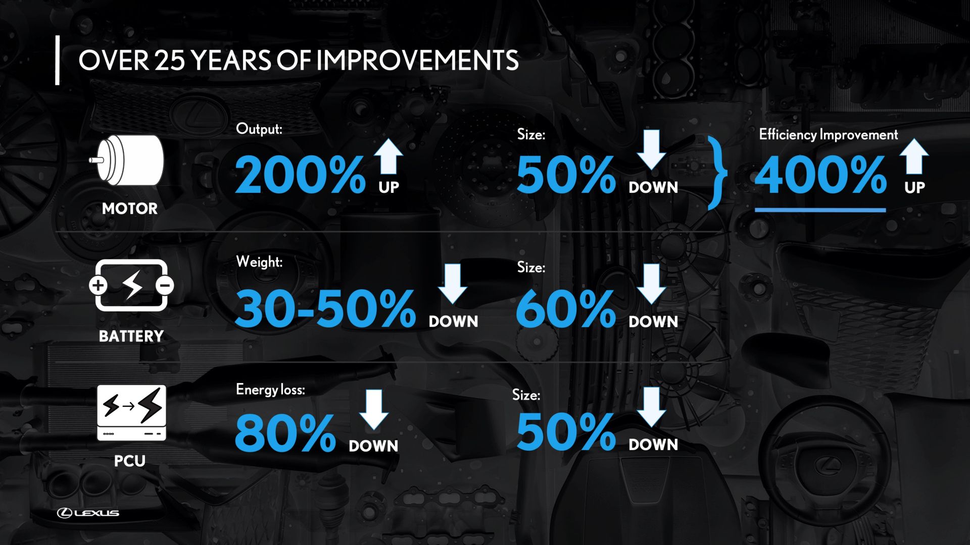 Ovaj neprekidni napredak je postignuti tako što su se Lexusovi inženjeri usredotočili na razvoj kompaktnijih i rafiniranijih sklopova koji pružaju bolje performanse. Tako su, tijekom zadnjih 25 godina, Lexus i Toyota registrirali preko 24.000 patenata za samopunjive hibride i tehnologiju električnih vozila – više nego ijedan drugi proizvođač automobila. Označavajući svoju vodeću ulogu na tom polju, Toyota Motor Corp. je 2018. godine objavila da će omogućiti pristup bez naknade svojim patentima za hibridna i druga vozila koja koriste tehnologiju elektrifikacije.