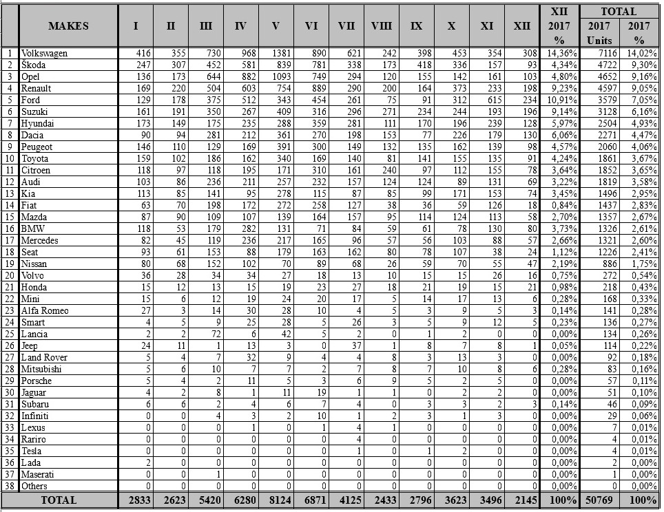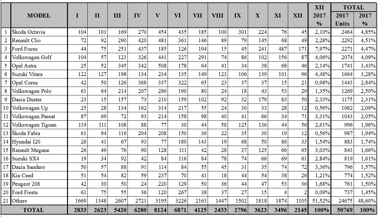 Pogledajte kompletnu listu novoregistriranih automobila u 2017, a koju već duži niz godina predvodi Volkswagen, a donosimo i najprodavanije modele – Škoda Octavia je vodeća, a slijede ju Renault Clio i Ford Focus dok se Volkswagen Golf smjestio na četvrto mjesto.