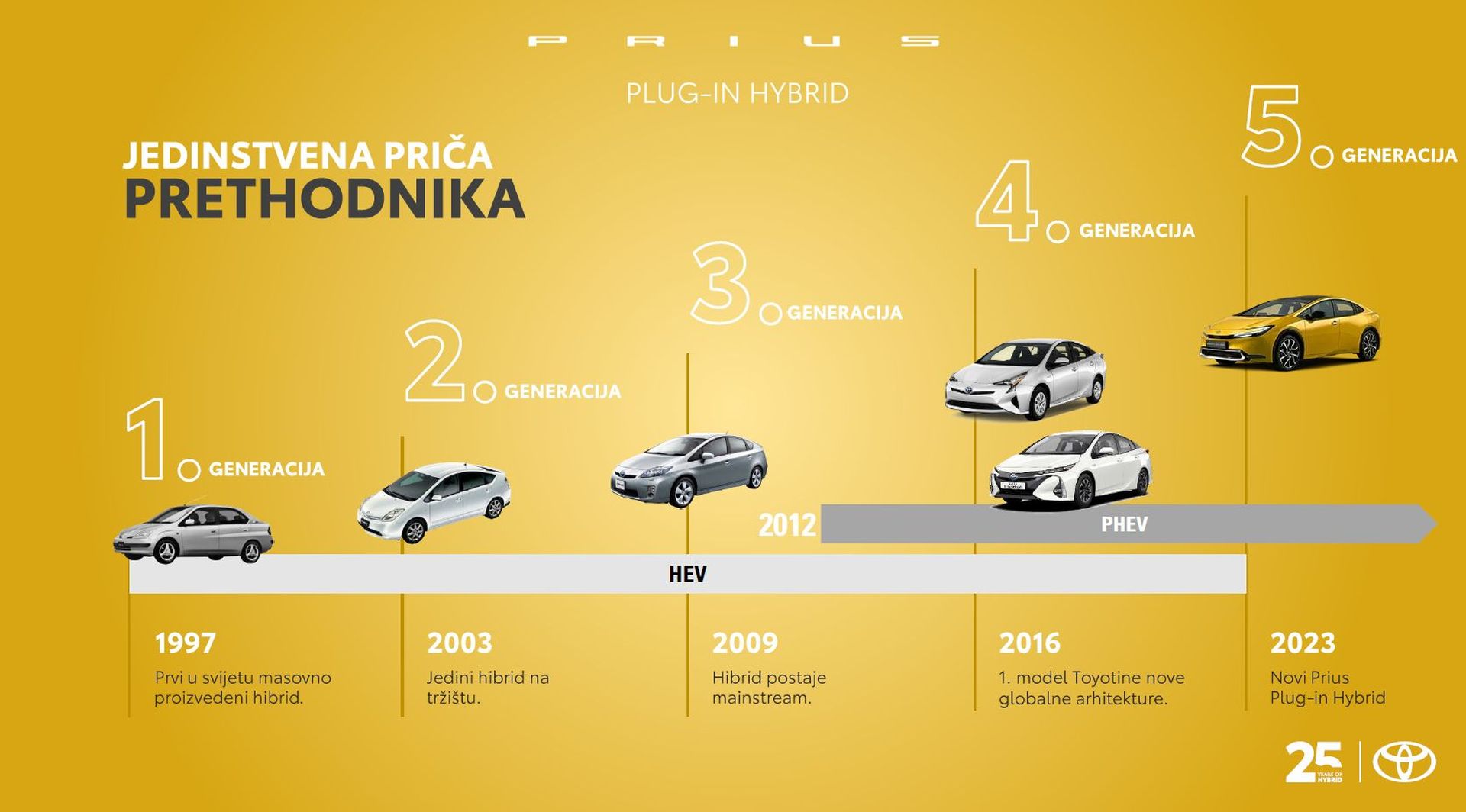 Prije 25 godina, Toyota je na tržištu predstavila model koji će u mnogočemu biti poseban. Osim što je prva generacija ovog automobila postala prvi serijski hibridni automobil koji se masovno proizvodio, čvrsto je pripremila put svim budućim hibridnim Toyotama ali i brojnim hibridnim modelima drugih proizvođača. Naravno, radi se o Toyoti Prius. Prius je plasiran na tržište pod sloganom „Upravo na vrijeme za 21. stoljeće”, a kupcima je vrlo brzo zapeo za oko zahvaljujući posebno izgledu za jednu limuzinu. Svojim izlaskom osvaja titulu Japanskog automobila godine, a već 2000. godine kreće i na svjetsku scenu, nakon čega su ga brzo prepoznali i zavoljeli ekološki osviješteni kupci u Europi i SAD-u.