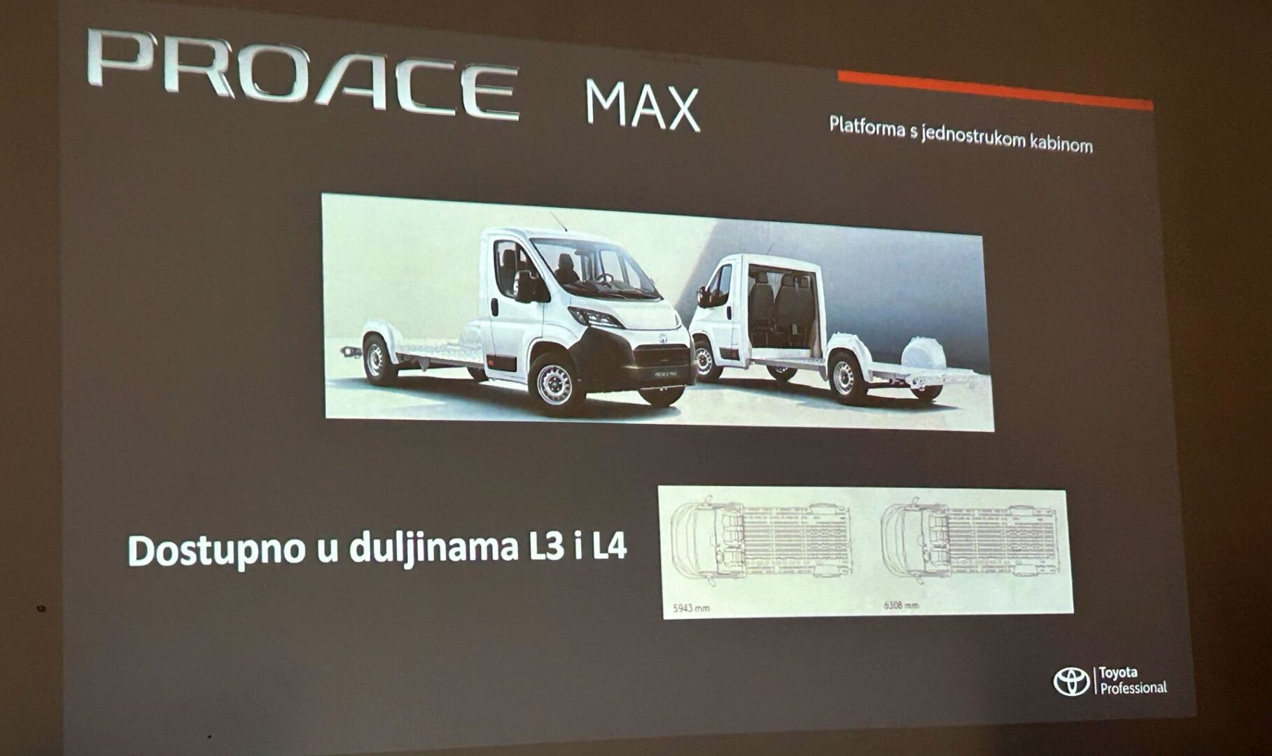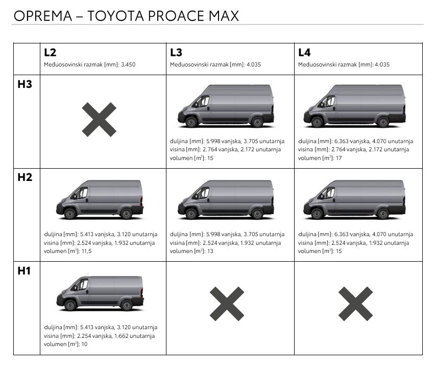 Toyota opasno ulazi na tržište dostavnih vozila, a sada je ponuđen i treći, ujedno i najveći kombi u ponudi – Proace Max. To je Toyotin prvi teški kombi u Europi, a dostupan je s električnim pogonom, ali i s tri dizelska motora, a upravo će potonji biti najzanimljiviji domaćim kupcima. Izvana se glavni dizajn dijeli s braćom, no Toyota donosi vlastite dizajnerske detalje, kao što je gornji element  maske u boji karoserije, a tu su u LED svjetla za maglu koja prate zavoj, kao i dnevna LED svjetla.