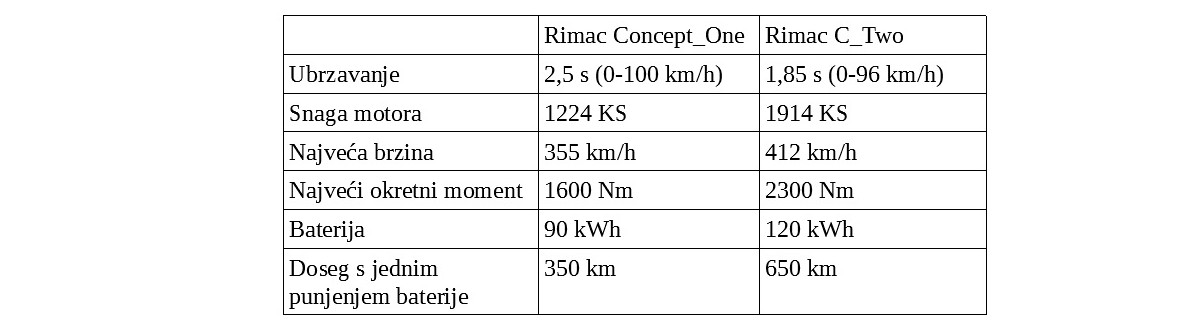 Potpuno električni Rimac C_Two snagu od 1914 KS dobiva iz dva prednja i dva stražnja električna motora. Naprijed se nalaze dva jednostupanjska mjenjača a straga su dva dvostupanjska mjenjača, dakle svaki kotač ima svoj mjenjački sklop. Rimac All Wheel Torque Vectoring System (R-AWTV) pandan je tradicionalnim ESP i TCS sustavima za kontrolu trakcije i dinamičkih performansi vozila, iz razloga kako bi se uopće mogle kontrolirati snaga i moment. Znamo da C_Two s mjesta do 96 km/h ubrzava za 1,85 sekundi, što je u odnosu na direktnog konkurenta, Tesla Roadster, čak i nešto brže. Treba napomenuti kako Teslin Roadster nudi četiri sjedala.