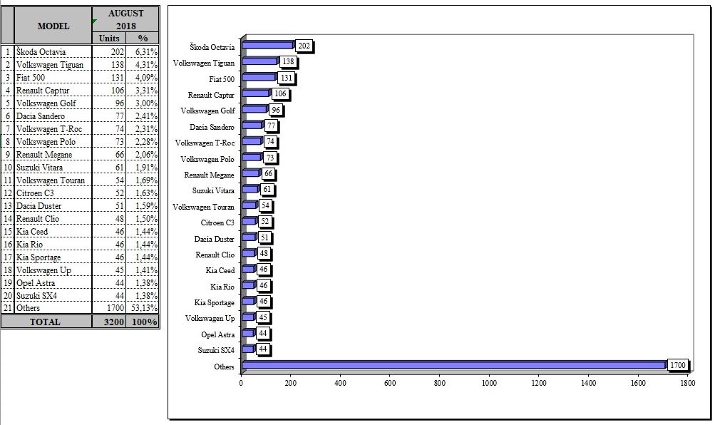 Promocija plus je, uz registracije novih automobila u Hrvatskoj u osam mjeseci objavila i 20 najbolje prodavanih modela automobila čiji su vlasnici po prvi put obavili registraciju vozila. Škoda Octavia i dalje je uspješan model, prodan u 202 primjerka u kolovozu 2018, slijedi Volkswagen Tiguan dok je na trećem mjestu pravo iznenađenje priredio Fiat 500 sa 131 prodanih primjeraka. Ne znamo koliko će ih u konačnici završiti u Hrvatskoj, ali raduje nas ova brojka za predivni i zabavni gradski automobil.