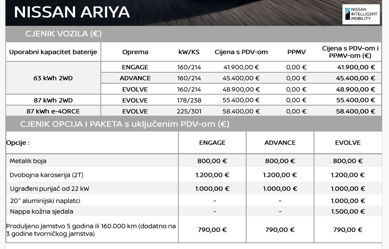 Osnovna Ariya dolazi s baterijom kapaciteta 63 kWh s kojom bi trebala imati autonomiju od 404 km, a jedino je ova baterija dostupna s motorom od 160 kW/214 KS i u sva tri paketa opreme – Engage, Advance i Evolve. Cijene kreću od 41.900 za osnovni paket opreme do 48.900 za najbogatiji paket opreme.