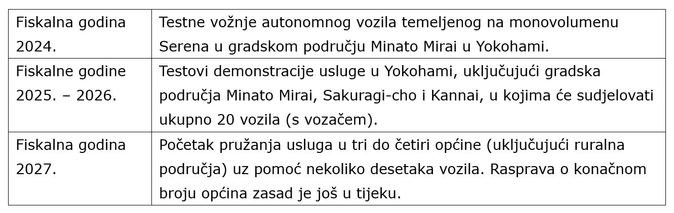 Ohrabren novim znanjima, Nissan u suradnji s trećim stranama, kao što su lokalna tijela i prijevoznici, namjerava ponuditi usluge autonomne mobilnosti s početkom fiskalne godine 2027. Testiranje usluge započet će u fiskalnoj godini 2024. u gradskom području Minato Mirai, dok bi se u sljedećoj fiskalnoj godini testiranje moglo proširiti i na druga područja. Tijekom razdoblja testiranja, razina autonomne vožnje postupno će se optimizirati u skladu s ocjenom prihvatljivosti takve usluge kod kupaca, a sve kako bi se omogućili oblici prijevoza bez vozača.