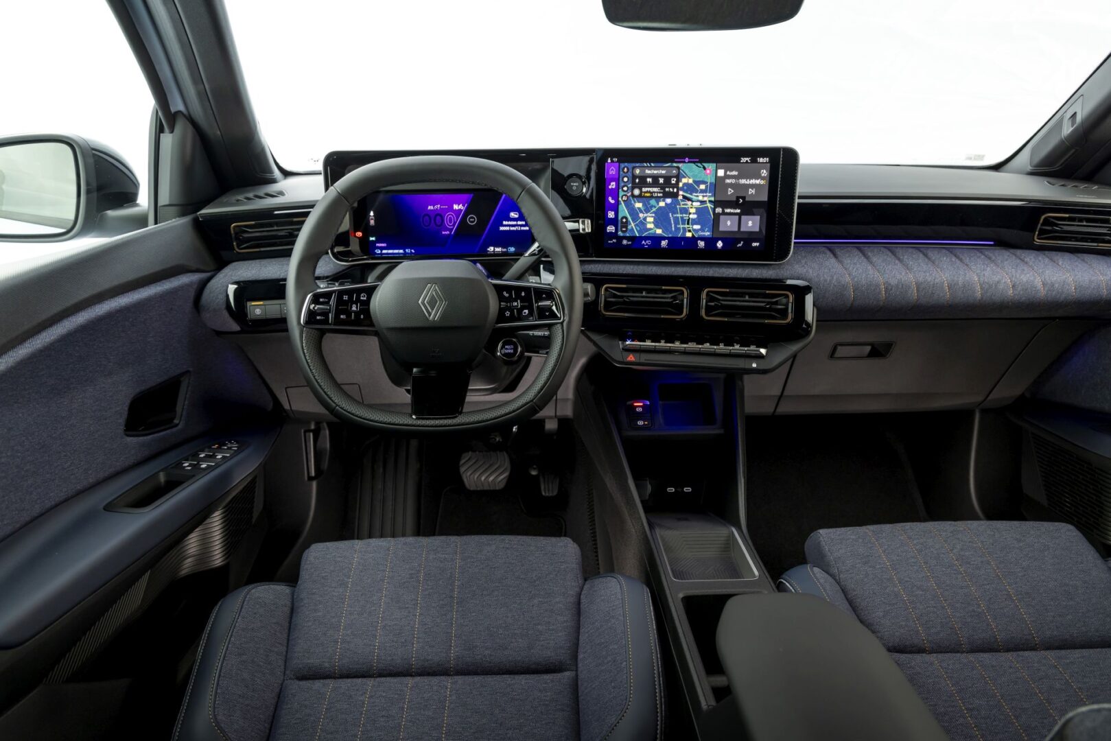 Izgled unutrašnjosti je jednak onoj iz modela R5, no dolazi u drugim kombinacijama, a ovisi o razini opreme. Na razini Evolution, pogled odmah pada na svijetle boje armaturne ploče i obloge vrata, koje su u kontrastu s tamnosivim presvlakama i šavovima u boji francuske zastave. Na razini Techno sve se vrti oko trapera. Kombinacija tamnoplavog tekstila i reciklirane poliesterske tkanine visokozasićene plave boje snažno nalikuje trapericama koje nosimo svaki dan. Bakrene zakovice na bočnim stranama sjedala kriju iznenađenje, natpis: Allez-y vous êtes en Renault 4 („Samo naprijed, u Renaultu 4 si”). Čak su i šavovi bakrene nijanse slične onima na trapericama. Tkanina s presvlaka s dijamantnim uzorkom prisutna je i na armaturnoj ploči i oblogama vrata.