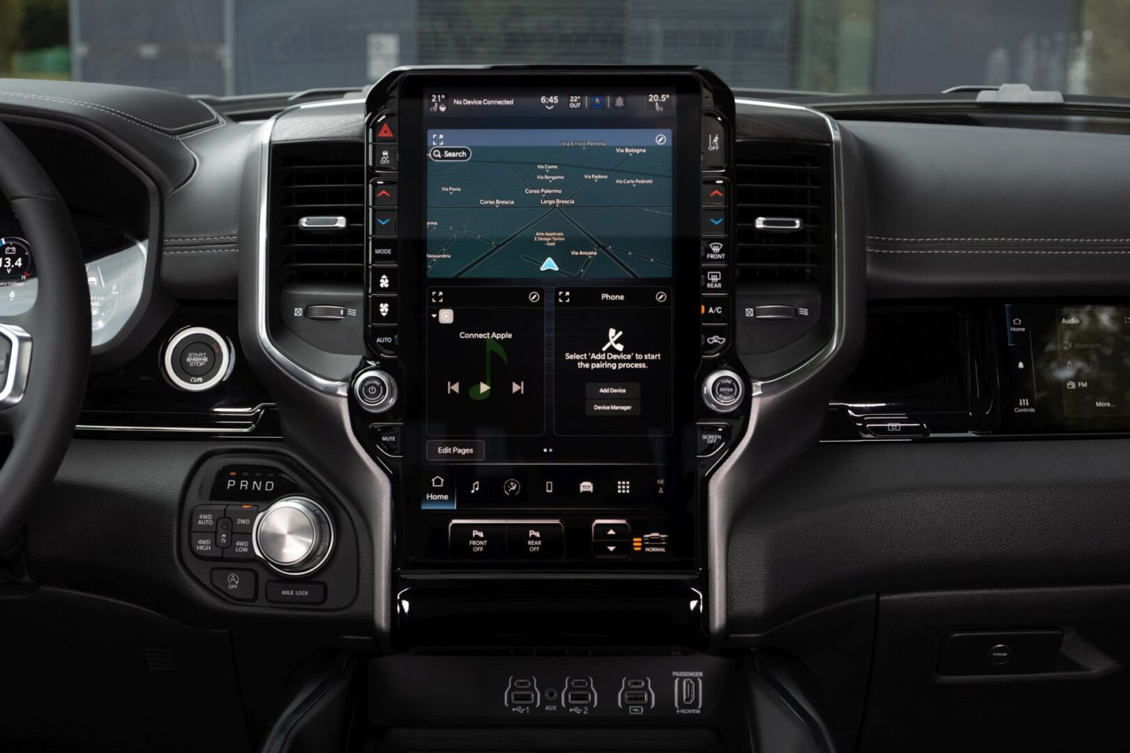 Ram 1500 nudi nekoliko veličina zaslona, sa središnjim multimedijskim koji ide do veličine 14,5 inča, dok je ispred suvozača može naručiti dodatni 10,25-inčni zaslon, na kojem se mogu gledati filmovi, ali i prikaz s kamera ugrađenih na vozilo. Digitalni instrumenti pak dolaze na zaslonu od 12,3 inča. Sve se pokreće na najnovijoj inačici softvera Uconnect 5, a dostupan je i digitalni retrovizor.