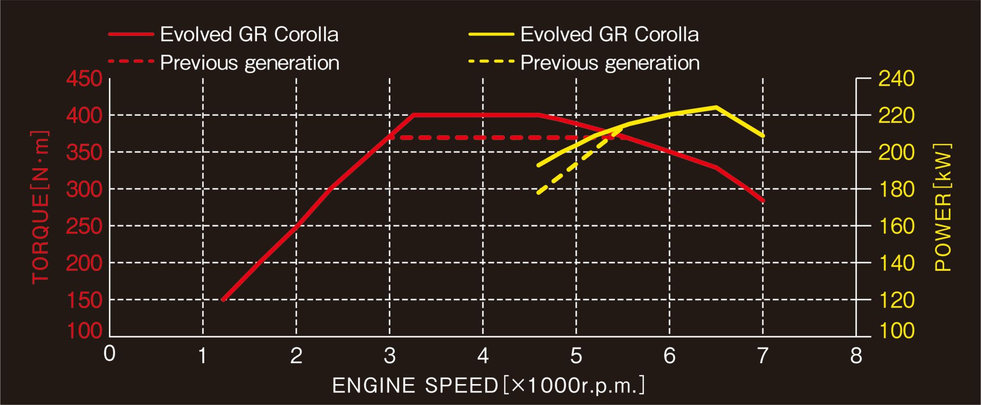 Unaprijeđena GR Corolla iskorištava uvide stečene natjecanjima u moto sportovima kao što je Super Taikyu serija za poboljšano ležanje u zavojima pri velikim brzinama, ubrzanje i hlađenje. GR Corolla je dostupna s novorazvijenim 8-stupanjskim GAZOO Racing izravnim automatskim mjenjačem koji se nalazi i u unaprijeđenom GR Yarisu. Na temelju povratnih informacija Hiroakija Ishiure i drugih profesionalnih vozača utrka, internih vozača za ocjenjivanje i Toyotinog glavnog vozača Morizoa, razvoj je nastavio unošenjem u vozilo neukroćene energije zbog koje želite nastaviti voziti, bilo na granici ili u svakodnevnoj uporabi.