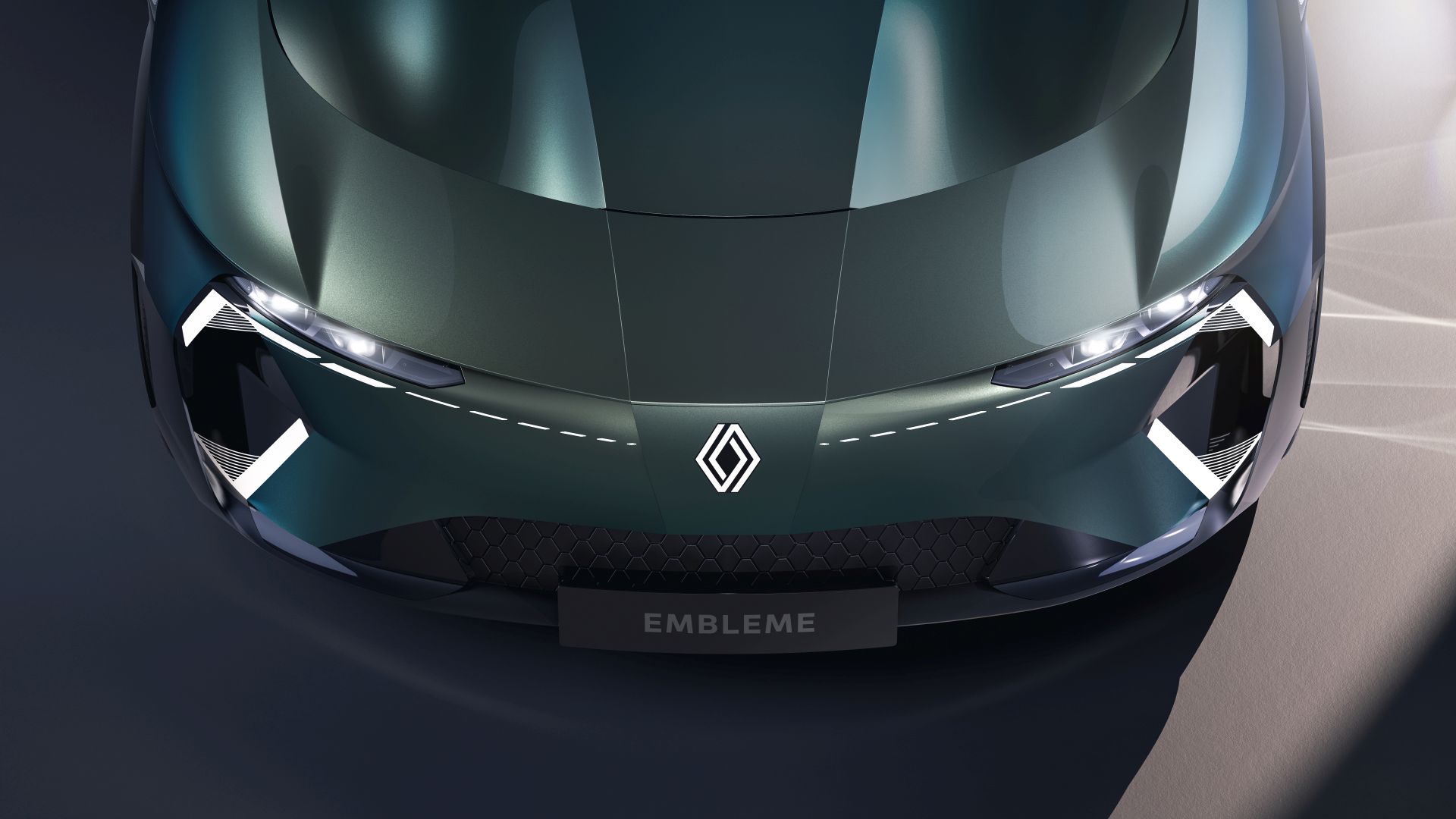 Dizajn je posebno prilagođen upotrebom tehnologije digitalnih dvojnika i najnaprednije opreme za digitalnu simulaciju koju je, u okviru unosne suradnje tvrtki Renault i Ampère, osigurala momčad BWT Alpine F1. Oslanjajući se na zajedničku stručnost, uspjeli su optimizirati pasivna i aktivna aerodinamična svojstva te ostvariti učinkovitu propusnost zraka. Renault Emblème ima sjajan koeficijent otpora zraka (Cx) od 0,25. Naglašene obline i linije karavana dodatno ističe dvobojni učinak zelene karoserije čije se nijanse mijenjaju ovisno o tome iz kojeg se kuta promatra. Renault Emblème na profinjen način spaja odlike karavana (njegov veliki međuosovinski razmak iznosi 2,9 m), coupéa (visok je 1,52 m) i fluidnu krovnu liniju. Vozilo je dugo 4,8 m te je kao stvoreno za udobna putovanja s obitelji i svom njihovom prtljagom. Osim toga, Emblème potvrđuje Renaultovu namjeru da, u skladu sa svojom strategijom temeljenom na vrijednosti, nastavi stvarati inovacije u C-segmentu i šire. Nadalje, njegov prepoznatljiv i tehnološki napredan svjetlosni potpis otvara prostor za istraživanje mogućnosti dizajna, nadahnutog čuvenim Renaultovim logotipom.