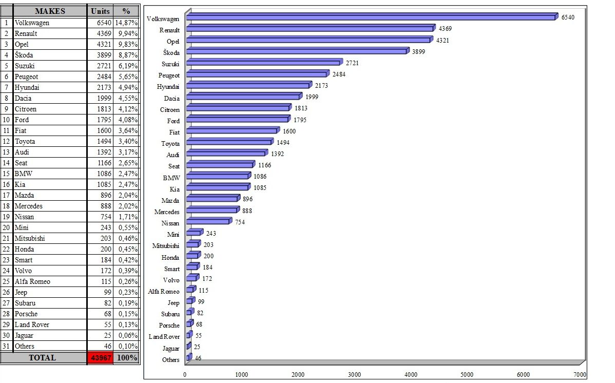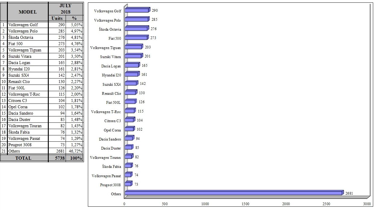 Na listi je već godinama prvi Volkswagen te je u srpnju 2018. prodao 1126 novih vozila, a u prvih sedam mjeseci 6540 vozila pa ima udio 14,87%. Slijedi Renault, na trećem je mjestu Opel, četvrtu poziciju drži Škoda, a petu Suzuki.
