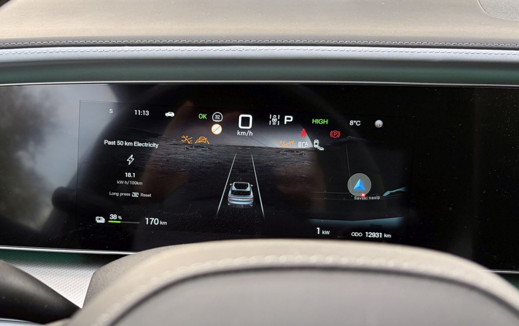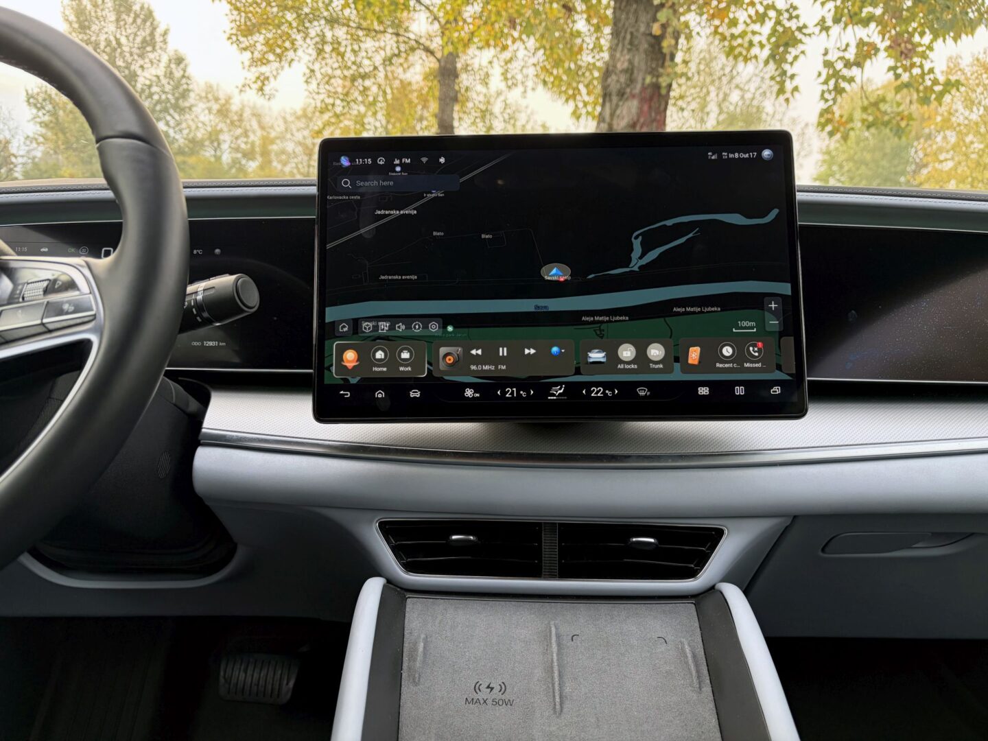 Ispred vozača se nalazi četverokraki upravljač dobro pogođene debljine, a na njemu se nalaze samo fizičke tipke, dok se na 10,25-inčnom zaslonu instrumenata prikazuje mnogo informacija, no ne možemo reći da je nečitljiv. Možda samo natrpan, no zato se najvažnije informacije mogu pratiti na head-up zaslonu. Središnjim dijelom komandne ploče dominira veliki 15,6-inčni zaslon, a da najlakše predočimo koliko je to, zamislite bilo koji standardni laptop jer i on ima zaslon jednake veličine. Fizičkih tipki nema, pa se sve podešava putem zaslona. A smiješna je situacija kada želite promijeniti temperaturu u kabini. Tipka na zaslonu je prilično mala, pa je morate ciljati, no istovremeno će vas automobil upozoravati da vratite pogled na cestu. Izgleda da ni u Kini nisu shvatili da se ne može ništa podešavati na zaslonu bez gledanja u njega, za razliku od fizičkih tipki, za koje nije potrebno micati pogled s ceste. Sam softver je dovoljno brz, a kao i u svim drugim modelima, moguće ga je rotirati da stoji okomito ili vodoravno. No kao i na ostalim modelima koje smo vozili, ako imate polarizirane sunčane naočale, zaslon ne smije stajati okomito jer onda na njega nećete vidjeti ništa.
