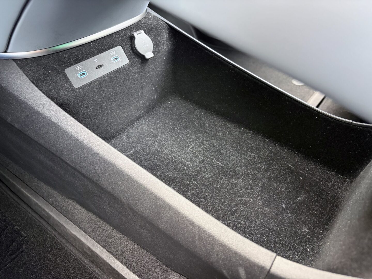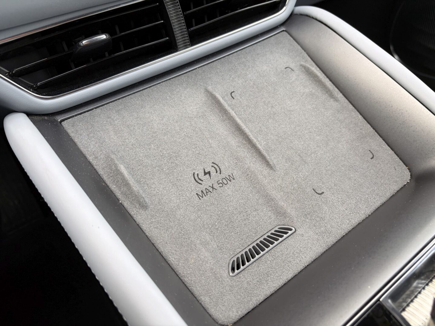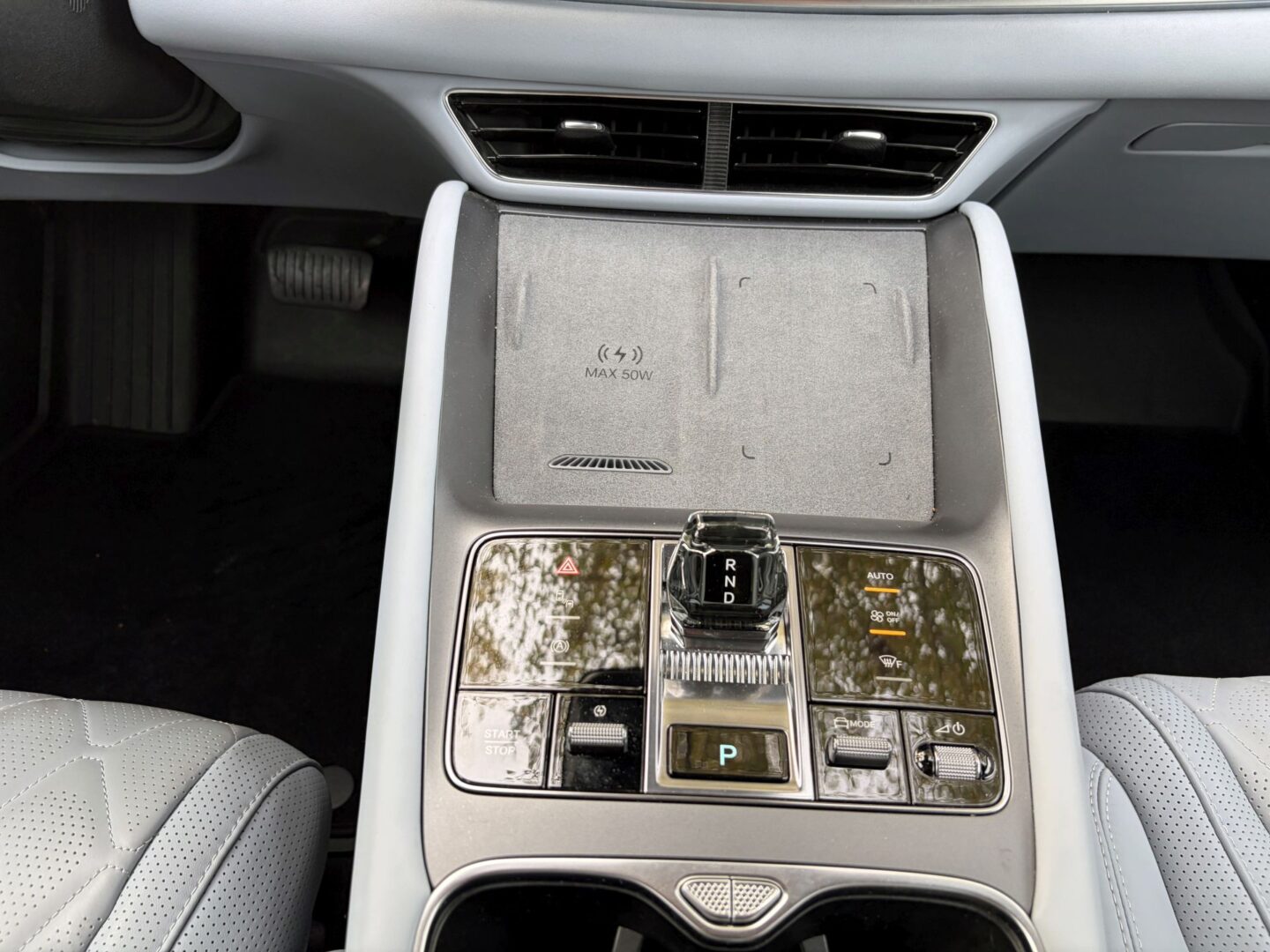 Na središnjoj konzoli se snalazi 50 W bežični punjač s hlađenjem te dodatna polica za odlaganje drugog mobitela, a tu je i malena ručica mjenjača, te tipke prečaca, kao i tipka za paljenje i gašenje automobila. Zanimljiva su i dva držača za čaše koji se mogu podešavati po dubini, a ispod čitavog tog dijela se nalazi donja polica s USB priključcima i prostorom za pohranu torbica. Na stražnjim sjedalima je također udobno, a ako sprijeda sjedi vozač prosječne visine, onda je straga i raskošno. Sjedala su jednako udobna, kao i središnji naslon za ruke. Za pohvalu je i što ima dovoljno prostora za glavu, bez obzira na to što je ugrađen stakleni krov.