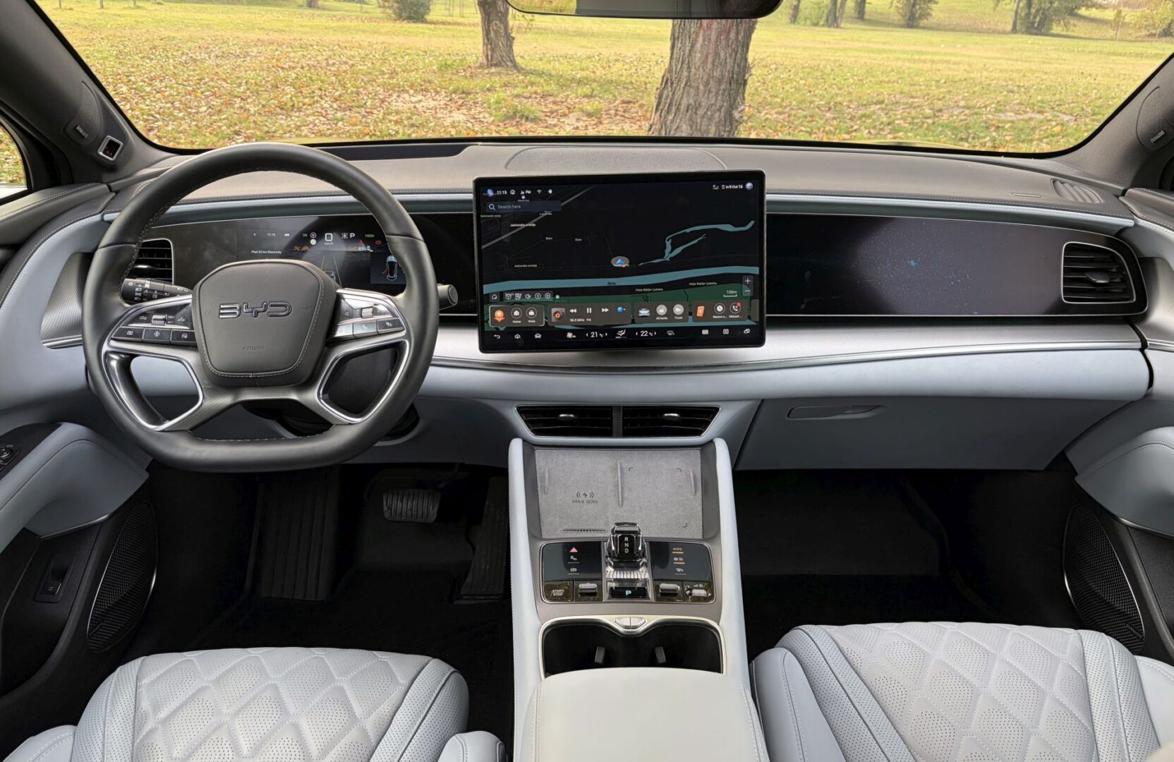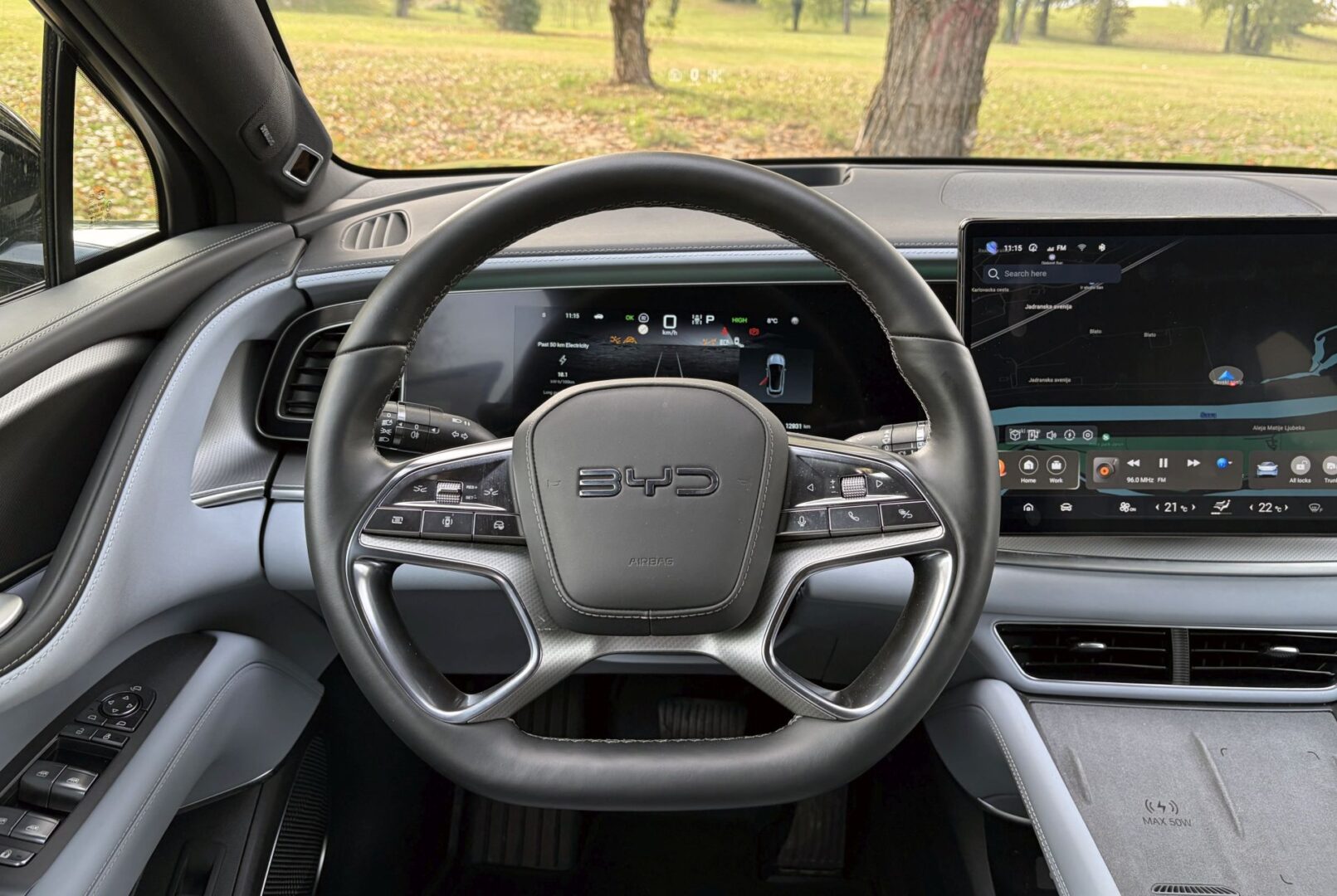 A ulaskom u kabinu, odmah dobivate onaj premium osjećaj o kojem smo pričali. Naime, vidi se kako su se u BYD-u posebno pobrinuli u kabini gdje prevladavaju površine od prave kože, a korištena plastika je meka na dodir. Osim toga, svakako trebamo spomenuti i kako su obloge stražnjih vratiju istog dizajna, a koriste se i isti kvalitetni materijali kao i na prednjim vratima. Prednja sjedala su izuzetno udobna i imate osjećaj kao da sjedite na kvalitetnoj fotelji, no voljeli bi da se nasloni za glavu mogu podesiti a ne da su fiksni, no zato ćete se bolje osjećati kada se sjetite da su prednja i stražnja dva vanjska sjedala grijana, a prednja su i ventilirana, po vam neće biti vruće na njima ni ljeti. Prostora je stvarno puno i u širinu, a to možete vidjeti i po dosta širokom naslonu za ruke, pa neće biti laktarenja vozača i suvozača.