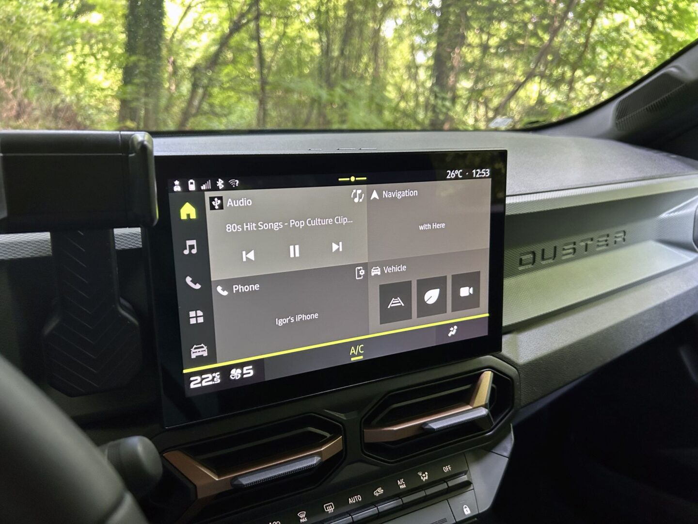 A sprijeda je sada još više prostora za vozača i suvozača uz potpuno nov dizajn instrument table. Da, i dalje je tu isključivo tvrda plastika, no zahvaljujući dizajnu i bojama sve izgleda prilično dobro, a što je najvažnije, sve je dobro posloženo. Nema škripanja ili klimanja, a tu su sada i najmodernije stvari. Tako je ispred vozača 7-inčna digitalna instrument ploča jednostavnog dizajna, no istovremeno jako pregledna, dok je u sredini ugrađen novi 10,1-inčni multimedijski sustav novog dizajna i puno bržeg rada nego prije. Osim toga, tu je i bežično spajanje s CarPlay i Android Auto uređajima, kao i dva USB-C uređaja + 12V utičnica, ali i bežično punjenje uređaja, koje do sada nije bilo dostupno. Osim toga, Duster sada nudi i grijanje upravljača, a time se, kao i grijanjem sjedala upravlja putem zaslona, dok su klimatizacijske tipke i dalje fizičke, smještene ispod samog zaslona, pa je i njime i dalje lako upravljati. Središnji naslon između prednjih sjedala je sada većih dimenzija i prilično udoban, no kako nije podesiv po dužini, samo će viši vozači od njega imati koristi, dok će onim drugima smetati.
