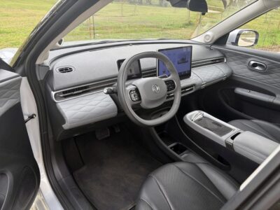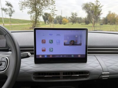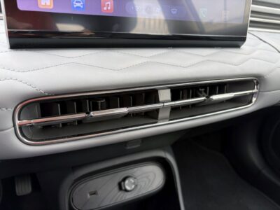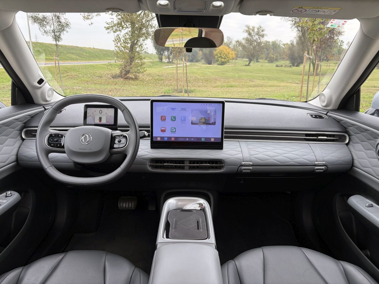 Ispred vozača se nalazi moderno dizajnirani dvokraki upravljač s fizičkim tipkama i posebnom tipkom prečaca kojeg sami možete konfigurirati, no podešava se samo po visini. Digitalni instrumenti dolaze na zaslonu od tek 5 inča, no prikaz brzine i svih funkcija je velik, pa nema problema s preglednosti. Središnji multimedijski zaslon jek dolazi u dijagonali od 12,8 inča koji je dovoljno brz za ugodan rad, no ne sviđa nam se što se klimatizacija podešava isključivo na njemu, bez ikakvih fizičkih tipki. Mana mu je i što ne podržava Android Auto ili Apple CarPlay, no uvoznik se za to pobrinuo, pa kupci dobivaju dongle, odnosno dodatak koji spoje u USB, pa putem njega sve funkcionira. Inače, glavna tema na zaslonu je mačka koja je smještena u dnevni boravak i koja za vas ima motivacijske poruke.