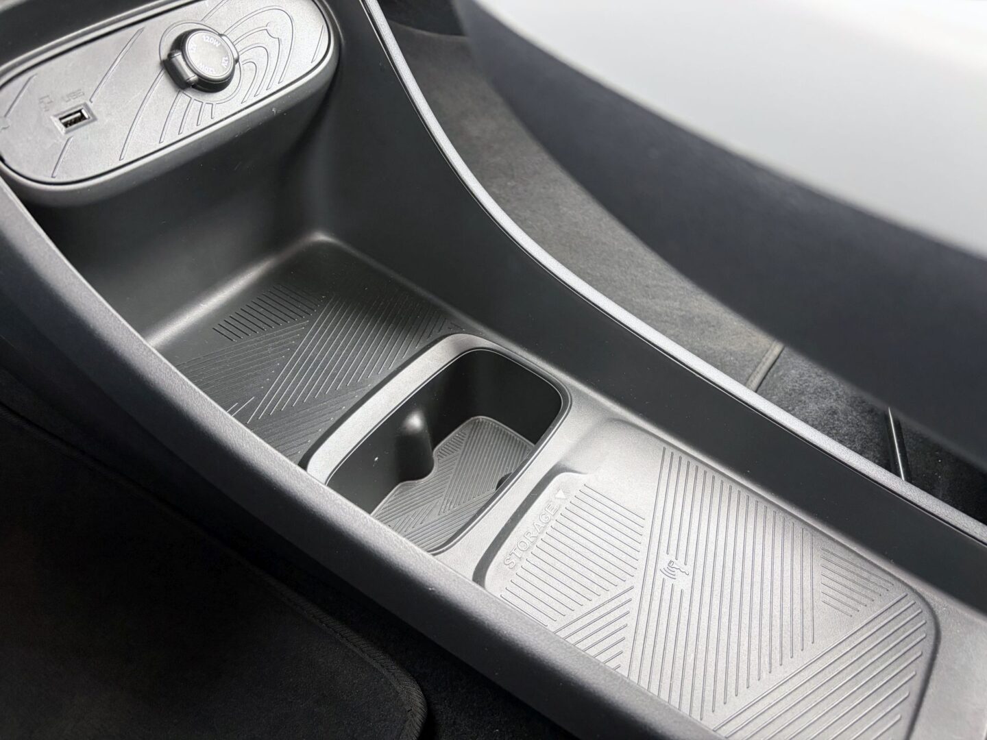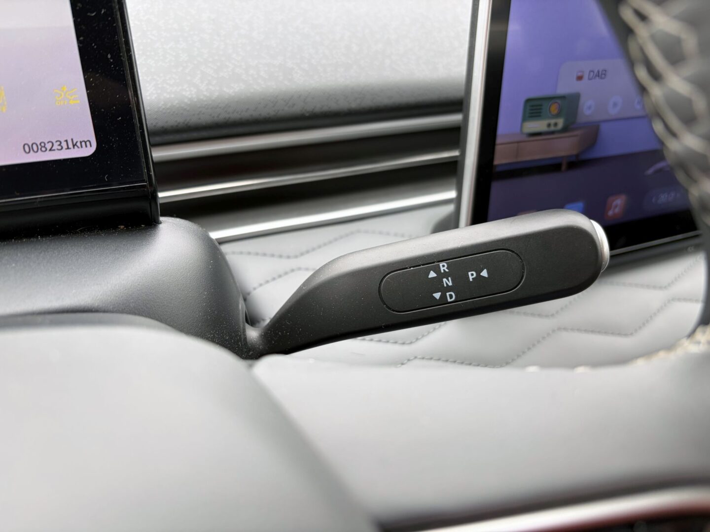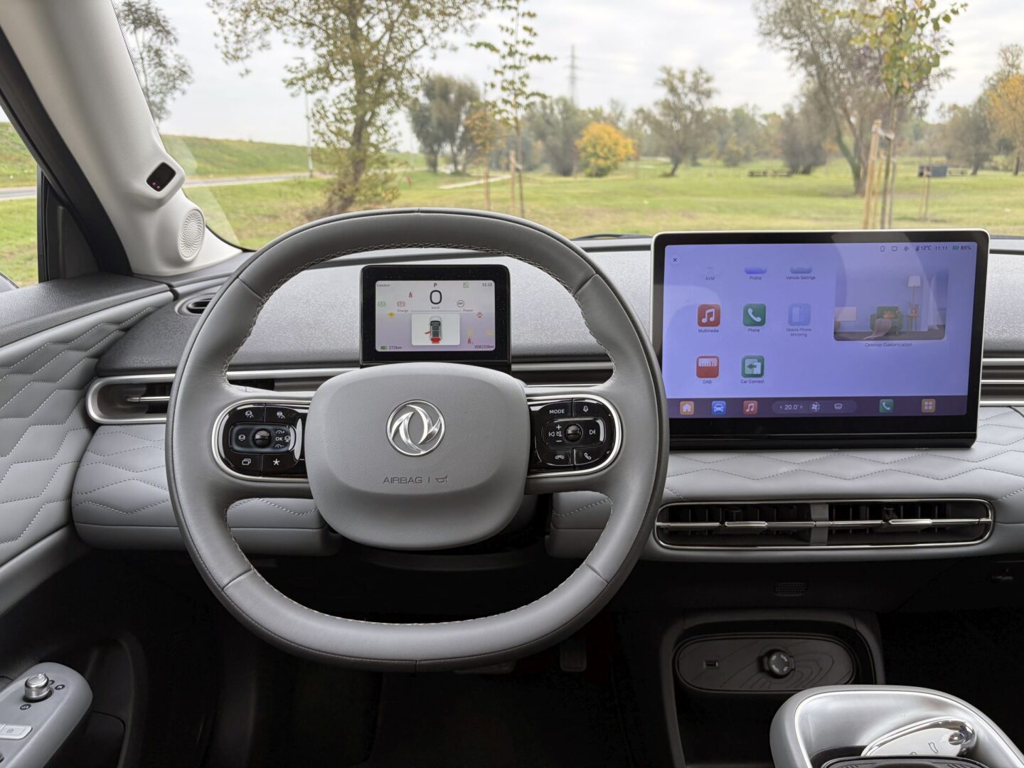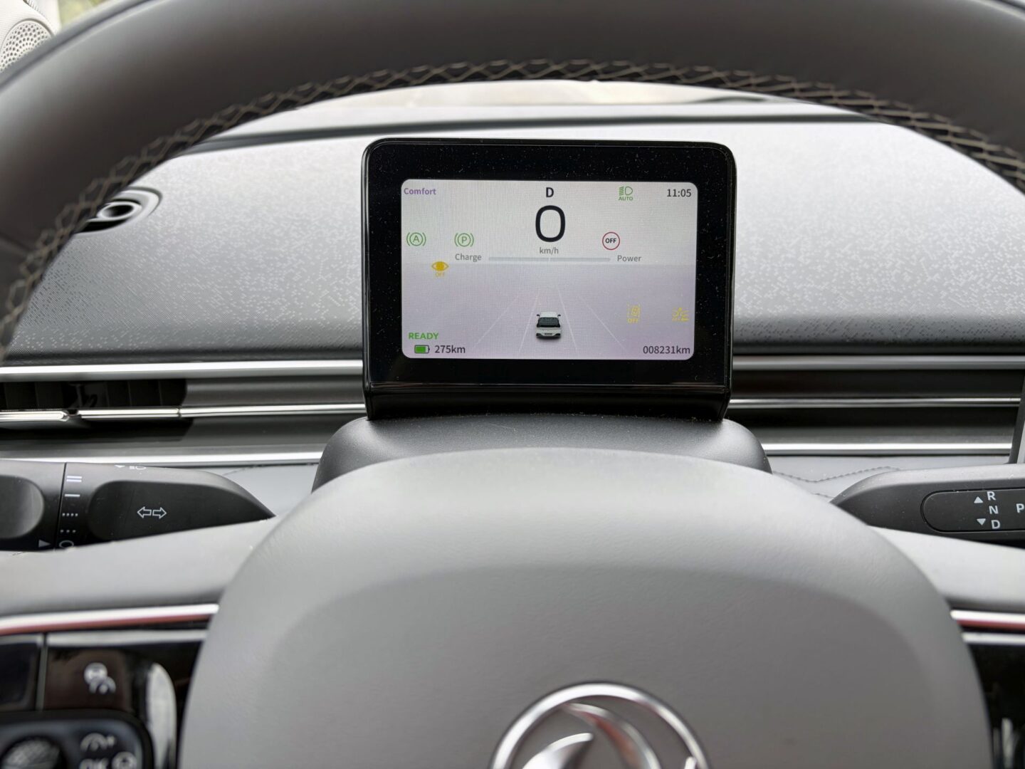 Ispred vozača se nalazi moderno dizajnirani dvokraki upravljač s fizičkim tipkama i posebnom tipkom prečaca kojeg sami možete konfigurirati, no podešava se samo po visini. Digitalni instrumenti dolaze na zaslonu od tek 5 inča, no prikaz brzine i svih funkcija je velik, pa nema problema s preglednosti. Središnji multimedijski zaslon jek dolazi u dijagonali od 12,8 inča koji je dovoljno brz za ugodan rad, no ne sviđa nam se što se klimatizacija podešava isključivo na njemu, bez ikakvih fizičkih tipki. Mana mu je i što ne podržava Android Auto ili Apple CarPlay, no uvoznik se za to pobrinuo, pa kupci dobivaju dongle, odnosno dodatak koji spoje u USB, pa putem njega sve funkcionira. Inače, glavna tema na zaslonu je mačka koja je smještena u dnevni boravak i koja za vas ima motivacijske poruke.