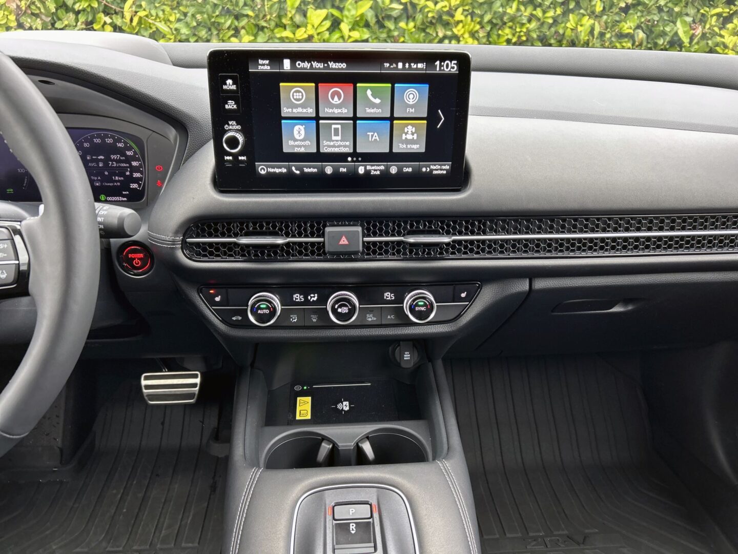 A dobrom ugođaju pridonosi i hibridni pogonski sklop oznake i-MMD koji se sastoji od dvolitrenog benzinskog motora koji razvija maksimalnu snagu od 105 kW/146 KS i pritom nudi 186 Nm okretnog momenta, te elektromotora koji povećava snagu i okretni moment na ukupno 135 kW/184 KS i 315 Nm. Oni su upareni s bestupanjskim CVT mjenjačem, a sve je posloženo kako treba. Naime, kod konkurencije ovakav sustav često zna ići u previsoke okretaje te se motor „dere“, no u Hondi je to napravljeno puno skladnije, a buka visokog broja okretaja je gotovo nečujna i rijetka. Bravo Honda. Također, kako je poznato i s prijašnjih modela, nema klasične ručice mjenjača, već se smjerovi vožnje biraju putem tipki. Potrebna je kratka prilagodba, no već nakon par dana nećete pogledati u smjer izbornika mjenjača kada ćete voziti.