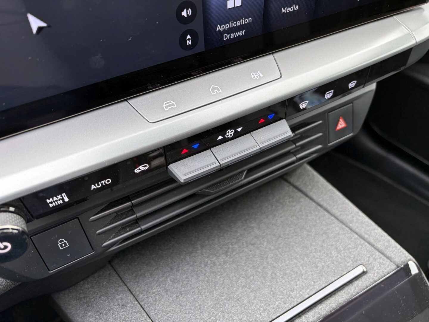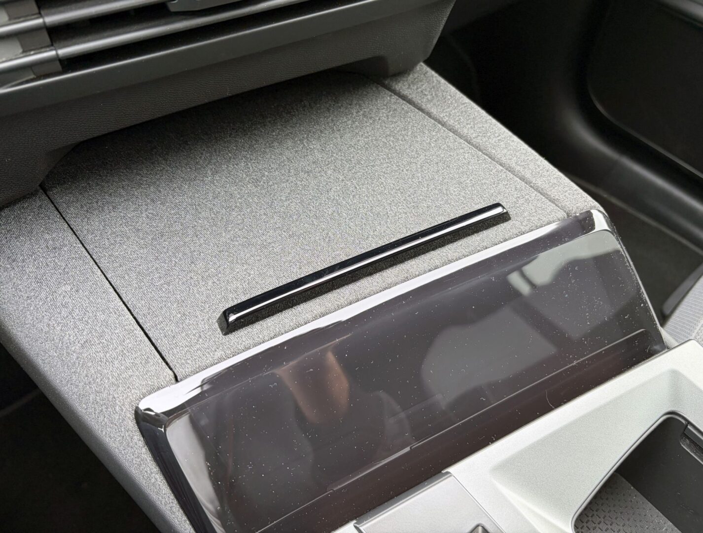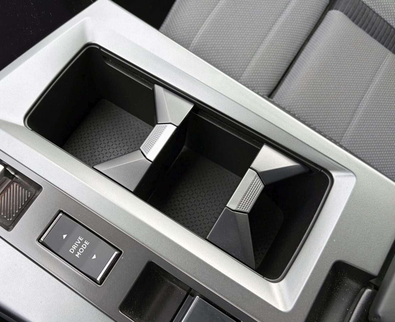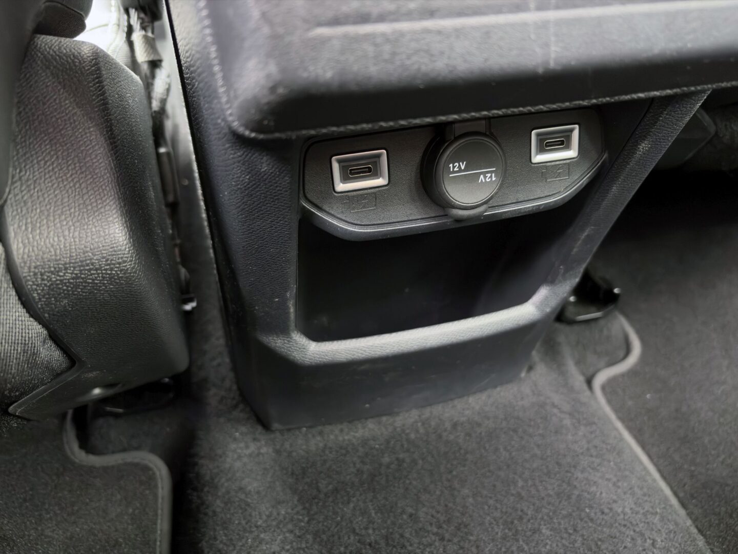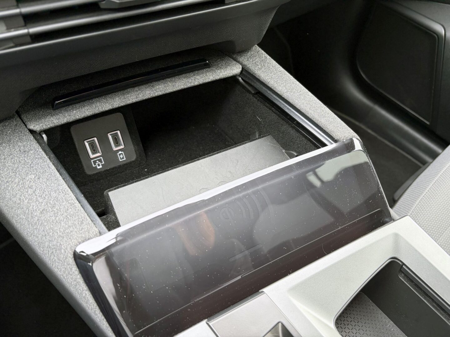 Svidio nam se i povišeni pretinac u središnjoj konzoli koji ima kližući poklopac, a u njemu se skrivaju USB priključci, kao i bežični punjač za mobitel, a s prednje strane je ugrađena tamna plastika koja sakriva od neželjenih pogleda prolaznika ako nešto ostavite u pretincu, no isto tako kroz nju se vidi kada mobitel zasvijetli kada prekine punjenje kako ga ne bi zaboravili uzeti sa sobom. Naravno, ispod se nalazi dodatna otvorena polica, a na gornjem dijelu je još i prekidač automatskog mjenjača, kao i tipka za odabir načina vožnje te nezaobilazni držači za čaše. Za pohvalu je i veliki i udoban naslon za ruke ispod kojeg se nalazi veliki zatvoreni pretinac.